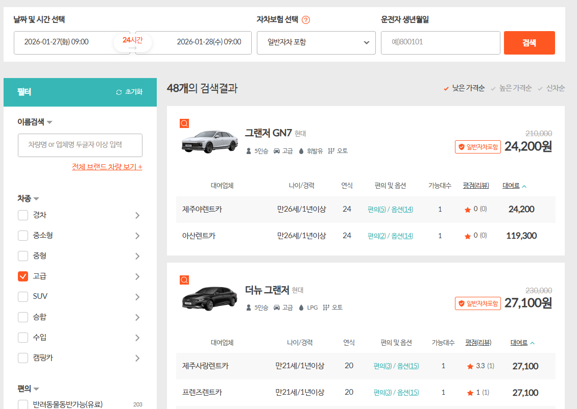 ■제주렌터카 차종별 최저가 조회정보