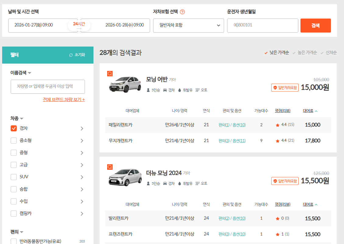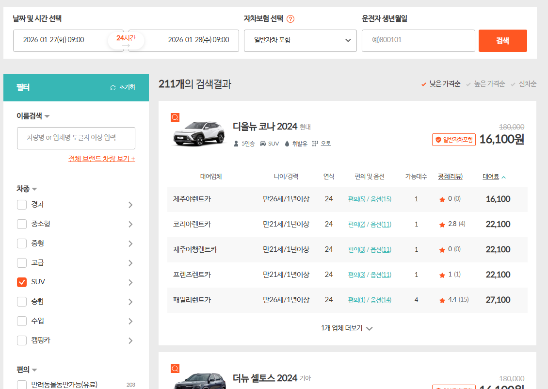 제주도 렌터카 59개 업체들이 보유한 전체 렌트카 13,054대를 가격순으로 기본 조회를 해줍니다. 엄청나게 많은 차량들을 가격순 등으로 차종별로 조회할 수 있으므로, 옵션을 잘 활용하시면 원하는 제주렌트카를 빠르게 조회하고 가격비교 하여 온라인대여 할 수 있어요.